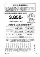 国民年金保険料の 捌諦朝肝階甜 1年間の前納制度を利用すると 3.850円 の割引があります 茨城県国民年金マスコットキャラクター 「フクちやん」 前納するとこれだけお得です 定額保険料 定額+付加保険料 毎月納付の場合 159,600円 13,300Hx12か月分 164,400円 (13,300H+400日)×12か月分 前納した場合 155,750円 160,430円 平成11年4月分から平成12年3月分 平成11年4月分から平成12年3月分 割 引 額 3,850円 3,970円 までに納めてください。 平成11年度の前納保険料は、 平成11年度の国民年金保険料は月額13,300円です。 (法律改正により、平成10年度と同額に据え置かれました) 風邪ひかぬ事を自慢の猫柳 飯 嶋 と み ふくろう 鼻やささくれゐたる楯十本 飯 田 勇一 つくしんぼ群れて一本ずつ孤独 中 村 革 介 覚えなき処ものの芽かがやけり 今 瀬 多代美 湯豆腐の薬味びりりと雨降れり 飯 村 愛 子 陽の差して久慈の薄氷輝けり 高 橋 芦 江 ぼっかりと雲薔薇の芽の伸びてを り 鯉 渕 寿美恵 ごたつ 父のかむ醤油せんべい春炬燵 竹 内 幸 子 缶蹴りの一人ぼっちの春帽子 いそペ き よ 空蒼く梅の香りの漂へり 阿久津 あい子 くっきりと杉の逆光日脚伸ぶ 長 須 きみの 風邪便り水栽培のヒヤシンス 菱 木 女江子 久慈川の水細々と春の鳶 瀬 谷 博 子 骨妃姉壇 広報じょうほく