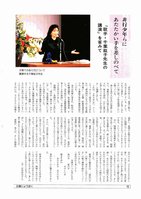 墨筆彗星茎書≡≒妻 憐虎 非行少年らに雫 講演」を省みて 歌手・千葉紘子先生の 、u l 子育てのあり方について 講演する干葉紘子先生 「非行少年らは、愛情に飢え、 心の支えを欲している。そして、 だれでも更生し、一日も早くあた たかい家に戻って社会復帰したい と願っている。 彼らを受け入れるのは家族しか ない。家族は子どもの悩みを受け 入れ、努力を認め、心から愛の手 を差しのべてやることが大切であ るLと強調しました。 これは、2月9日(日)、コミュ ニティセンター常北ホールで行わ れた「第謂回みんなで行う社会教 育の集いL (主催 町教育委月会) での、千葉紘子先生の諸演内容の 一つです。 当日は快晴に恵まれ、町民の方 や町議会議員社会教育委阜そ して、各学校PTA他教育関係者 等370名が参加し、子育てのあ り方を学び合いました。 演題は、-笑顔はいつも花にな るー・「母の手・愛の手・やさし い手Lで、社会教育の集いにふさ わしい内容のものでした。 その講演内容を簡単にまとめて みますと、まず、少年たちはあま りにも多い情報化社会の中にあっ て、それらをどう処理し、どう生 きていくべきか悩み、昔しんでい るために非行を起こしているとい うのです。これらのことを解消す るためには、子どもたちに情報を 選択し、処理する能力を培うとと もに問題にブレーキのかけること のできる子どもづくりをすること である、ということでした。 次に、問題のある家庭から非行 者が出ているというのです。問題 のある家庭とは、厳しすぎる、溺 愛しすぎる、ほったらかしすぎる 等、「〜しすぎる」家庭で、子ど もが何をやっても認めてもらえな い家庭のことだということです。 特に、溺愛しすぎは、何でも自 分の思い通りになるという子ども を作るというのです。窃盗は、溺 愛家庭に育った非行者に多く、放 任家庭に育った非行者には殺人者 が多いそうです。 子育てで大切なことは、普段か ら子供の自立に向けて、大人がど れだけ手助けしているかであり、 自分はダメな人間だと思わせない ようにすることだということでし た。 さらに、自分を案じてくれる者 がいない子どもは、不幸で、非行 に走りやすいそうで、自分のこと を心から案じてくれる人がいるか どうかで、子どもの生き方は大き く変わるといいます。案じてくれ る人がいれば子どもたちの心は安 定し、どんな困難にも立ち向かい、 乗り越えることができるのです。 家族が、友人が、そして地域社 ( 美声がホールに響きわたりまし た。 将来ある子どもたちを不幸にし てはならない。地域ぐるみではぐ くんでいかなければならないとい う思いを強くもちました。多くの ことを学んだひとときでした。 (文・広木長次さん) 会の人々が、子どもたちを心から 案じ、心の享えとなり、本当の愛 の手、やさしい手を差し伸べてあ げることが、子育てで最も大切な ことであるということです。々し て、笑顔を失わずに子どもたちに 接し、あたたかい人間味のある声 をかけてあげることこそ、子ども たちの生きることへの励みとなり、 成長への大きな力になるというこ とでした。 最後に千葉先生は、「海辺の少 年」の歌と「幸せとんぽどこにい るしの歌で講演を締めくくってく ださいました。 へ苦労ばかり多くても 笑顔はいつも花になる 母の手 愛の手 やきしい手 励ます声の あたたかさ あたたかさ 広報じょうほく