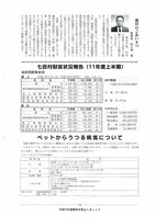 一日付けで教育委員会の承認を受け まして再度教育長に就任いたしまし た。 21世紀を目前とし、現在社会は少 子化・情報化・国際化等大変複雑多 様化の時代を迎えつつあります。本 村でも時代に対応すべく学校ともに 教育施設等の近代化を進めてまいり ましたが今年を持って小中学校共に 近代的施設として完成し、村民等し く喜びとするところでございます。 ご協力いただきました村民各位に心 からお礼申し上げます。 児童・生徒指導に閲しましては、 施設の有効活用と「学校・家庭・地 域の連携」をさらに緊密にし、児 童・生徒が心身共に発展できますよ うご示唆頂ければ幸甚でございま す。また、社会教育(生涯学習を含む) 共に向上できるよう微力ではありま すが頑張りたいと思いますので、村 民の皆様のご理解とご支援をお願い いたしましてご挨拶と致します。 就任のごあいさつ 教育長 阿久津 進 師走の候、村民 の皆様には益々ご健 勝のこととお慶び申 し上げます。 私こと、去る十月 くく壬〉〉くく壬〉〉くく壬〉〉くく壬〉〉くく壬〉〉くく壬>>くく壬>>くく壬H;くく壬〉〉くく壬‡〉くく壬〉〉くく壬}〉くく壬〉〉くく壬;〉くく壬>ラミく壬〉〉くく壬>〉くく今>〉くく壬>>くく壬〉〉くく壬〉>くく壬〉>くく壬>>くく壬〉>くく壬〉〉くく壬〉> 七会村財政状況報告(11年虚上半期) 会計別財政状況 歳 入 (平成11年4月1日~平成11年9月30日)(単位:千円・%) 会 評 名 予葦車 喪具襲垂 噴泉率 般 計 2,465,604 1,005,036 40.7 事業勘定 241,637 77,860 32.2 国民健康保険特別会計 施設勘定 338,530 86,121 25.4 老 人 保 健 特 別 会 計 325,098 145,082 44.6 簡易水道事業特別会計 522,222 9,013 17.2 地 域 振 興 券 特 別 会 計 15,197 15,166 99.8 村の財産 (平成11年9月30日現在∋ 土 地 717,195m2 建 物1邑,137m2 秤僚現露高 卜駿会計望,毎室数雷鰻千円き (停会施設 85,泣容子円き l利一余滴水 ・・17ti,47こ~T・ltl) 基 金1,4節す発表手円 有価証券 1望y2納車円 会 計名 予算額 収入済幸 収入率 般 計 2,465,604 667,232 27.1 事業勘定 241,637 68,143 28.2 国民健康保険特別会計 施設勘定 338,530 149,300 44.1 老 人 保 健 特 別 会 計 325,098 115,124 35.4 簡易水道事業特別 会計 522,222 23,347 44.7 地域振興券交付事業特別会計 15,197 13,189 86.7 ペットからうつる病気について 家庭で飼育されているかわいい動物から、私たち人間にうつる危険な病原体を持っていることをご存知ですか。 いまやペットは、家族の一員になっており、人間と同じ環境にあります。ペットの健康については、常日頃 から注意し、特に人にうつる病気については十分な注意が必要です。 ○ペットからうつる主な病気 檻 感 染 源 病 名 回虫症・カンビロバクター症・ブルセラ症・パスツレラ 犬 ・ 猶 レプトスピラ感染症・クリプトスポリジウム症・ リステリア症・ネコひっかき症・サルモネラ症 鳥 類 オウム病・カンピロバクター症・クリプトスポリジウム症 終核(鳥塑) は虫類・魚類 サルモネラ症 ○ペットの定期的な健康診断 ○ペットにさわったら手を洗う(消毒効果のあるもの) 予防対策 ○こまめに掃除をする ○口移し、キッスは感染の恐れがあるためやめる 0糞便処理後の消毒 問い合わせ 茨城県動物指導センター 防疫課 電話 029672-1200 子供の交通事故を防止しましょう
