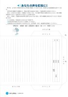 目≦あなたの声を町政に1町では、より多くの町民の皆さんに町政に参加していただくため、封書による提案制度を設けています。日術生活や地域での課題など、町政に関する自由なご意見.ご提案を町にお寄せください。なお、いただいたご意見.ご提案につきましては、できる限りIll)-政に反映させるとともに、個人情報を伏せたうえで、公表させていただくことがあります。また、ご意見.ご提案の内容が町に関するものでない場合、相当の機関に回付させていただく場合があります。●この封書は、平成22年3月31日まで有効です。●封書は切手を貼らずにポストに投函してください。●無記名のものにはお答えできませんので、必ず住所・氏名・電話番号を明記してください。【問合せ】総務課秘書・広報広聴G(3029-288-3111内線211,214)〃、きりとり線〃、震~~~、一一ロノ一/、のりしろ§兇-1、、。■■“■■■d■ddaで■d■■’l‐‐l‐‐‐a■■8号①■9ⅡBUDb00DDb99p99r0b6・上。上小■■。■。■■■ロ凸甲■甲一Jのりしろ0日0画固凸■■山,80.60‘■■/"〆戸タブのりしろきりとり線ノL---⑨広報しろさと.2009^1lj鹸零誘維含回垂郵蔀鞭願鼓嶺蔀南割