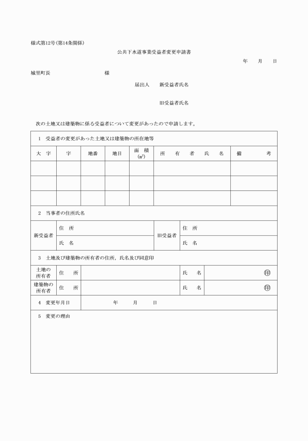 第16条 受益者又は納付管理人が住所又は事務所等を変更した場合は,変更した日から14日以内に,公共下水道事業受益者住所等変更届(様式第16号)を町長に提出しなければならない。